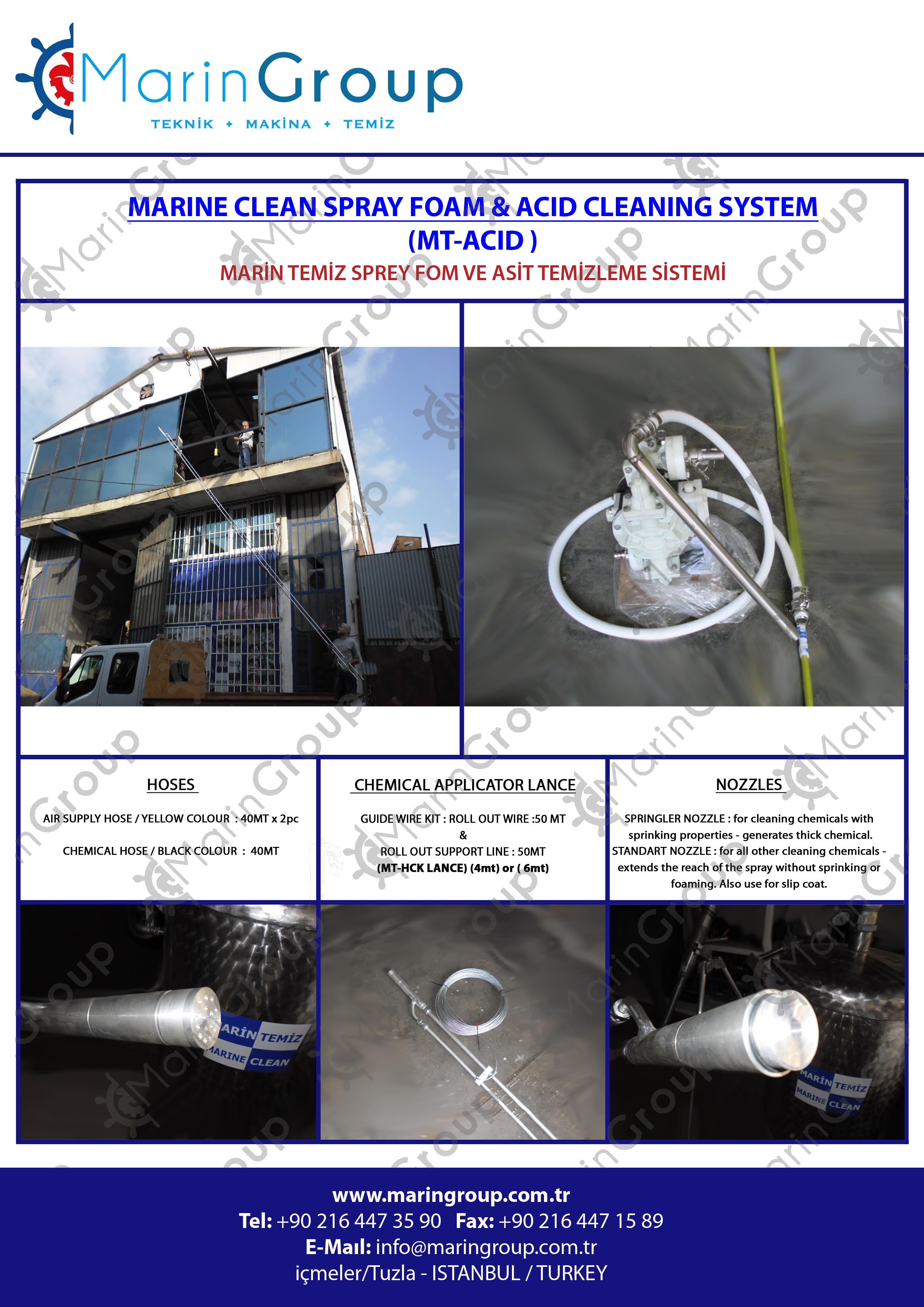 -A compact, versatile and effective Cargo hold cleaning system. -The Spray Foam system is easy to assemble and flexible in use. -The Spray Foam system can be used either with the stainless lance and nozzles for cleaning with acid or with the aluminium spray foam lance, for alkaline cleaners. -The Spray Foam System can also be use to apply Prewash, Fat Cargo Slip or other paint protective chemicals prior to loading.